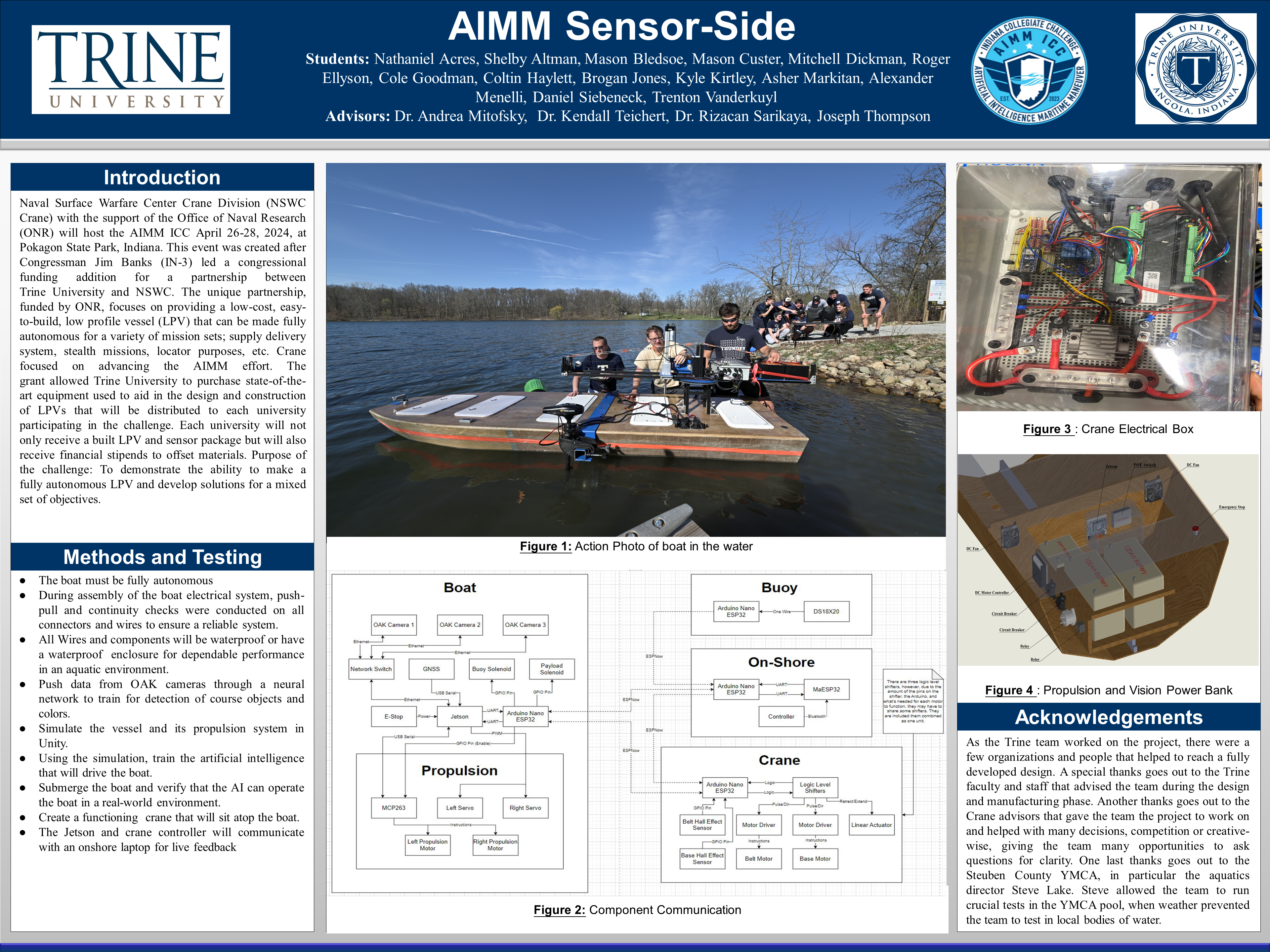 The Mechanical Engineering Department representing Trine University for the Artificial Intelligence Maritime Maneuver (AIMM) Indiana Collegiate Challenge (ICC) designed and developed a device to collect rings off buoys along a course and retrieve an object from the water safely. The team brainstormed and developed concepts for different subsystems for the device. Once the best system was chosen for the device, the team went through multiple iterations from gathering information from finite elemental analysis, real life material testing, prototyping, and computational fluid dynamics. Based on the testing and calculations the device chosen to complete the tasks mentioned earlier was a crane. Once the final iteration was designed, the team manufactured the crane and mounted it to the low-profile vehicle (LPV). Once the team had the crane securely mounted, the team worked with the Electrical and A.I. departments to clarify whether the crane was communicating with the rest of the systems on the boat. Once the mechanical team goes through multiple tests with the full team, including dynamic testing whilst mounted to the boat, the team will go to Pokagon State Park in Angola Indiana for the AIMM ICC. |